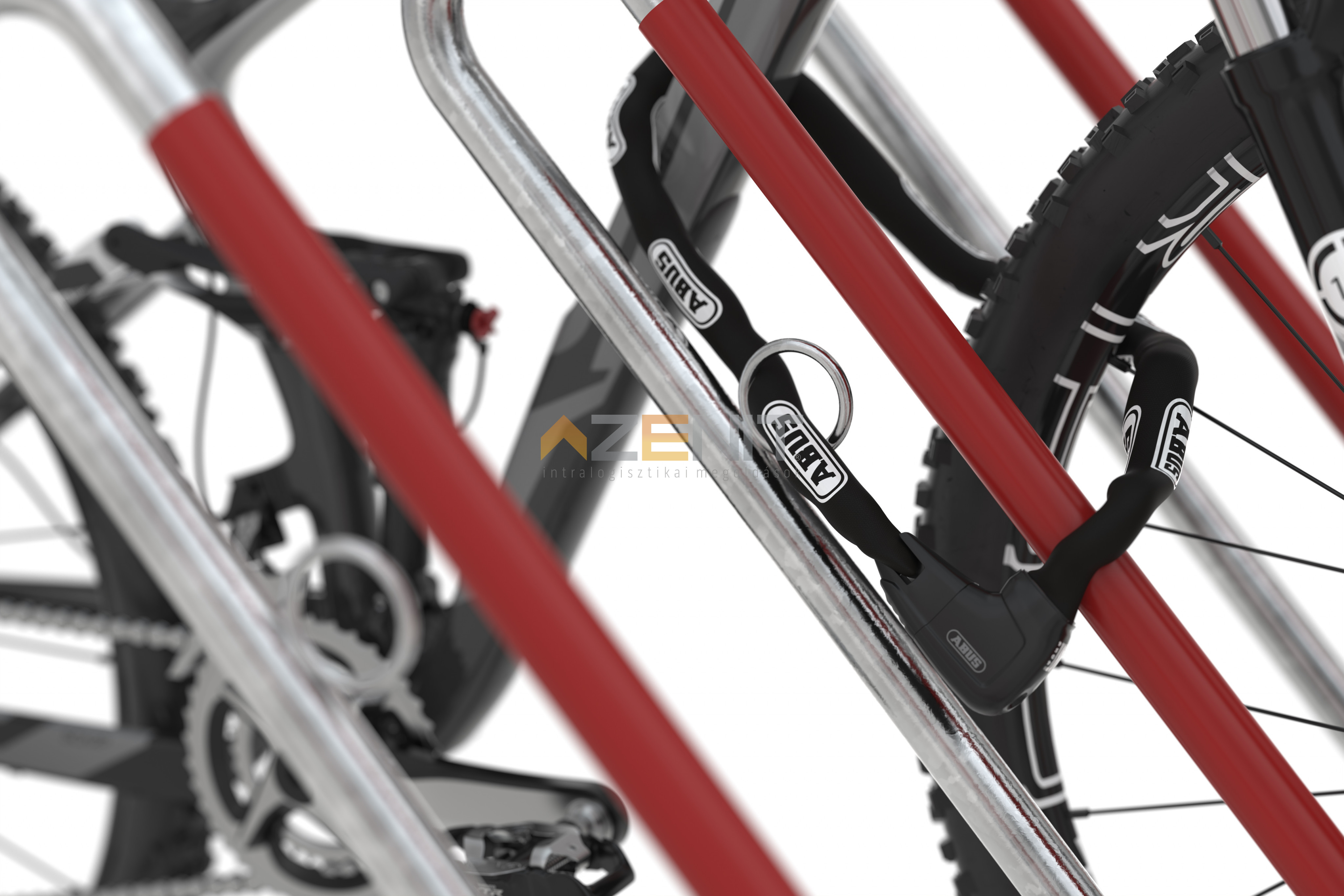 Modern kerékpártároló rendszer, piros műanyag védőburkolattal a ferde kengyelen