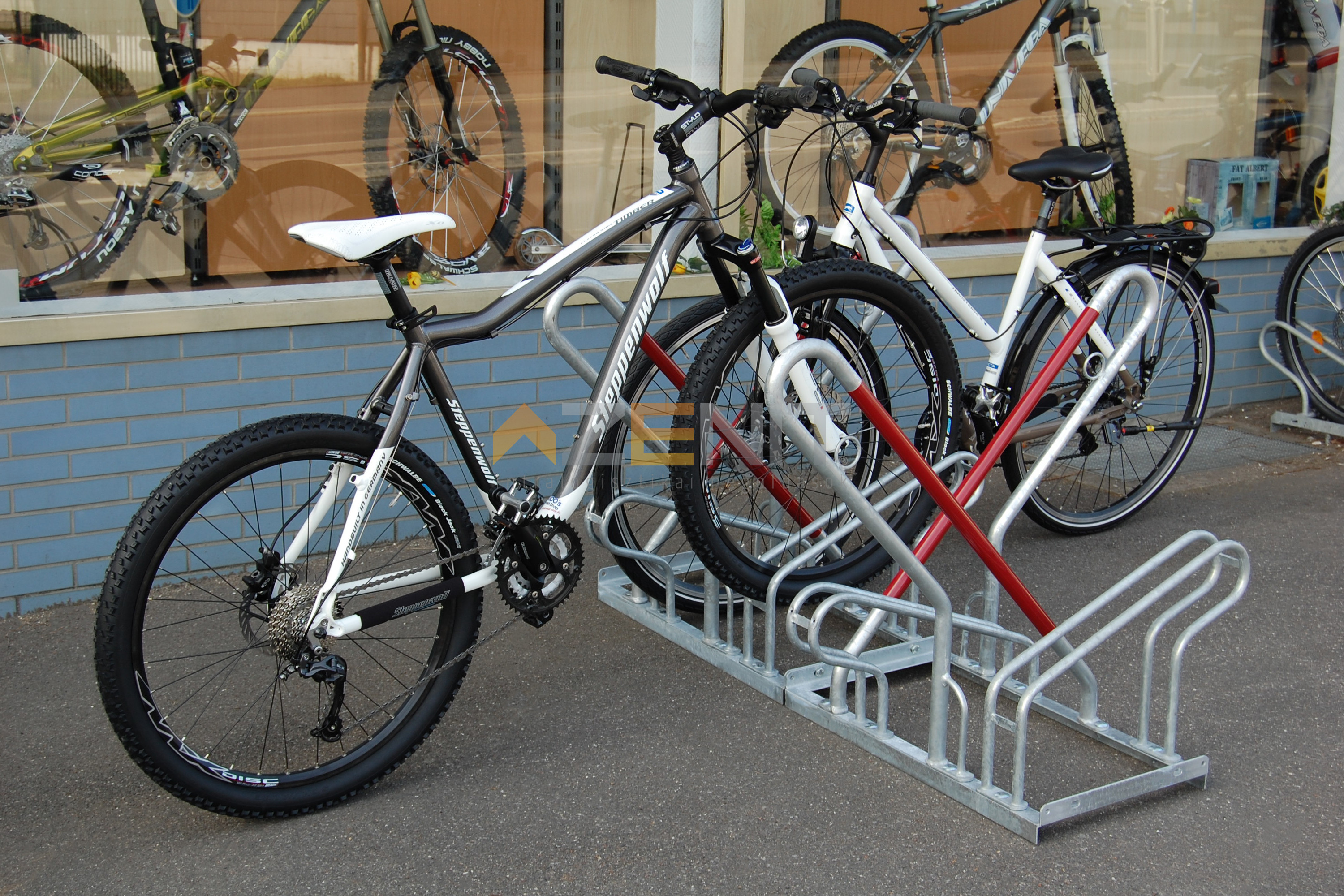 Modern kerékpártároló funkcionális támasztókonzolokkal. Itt nyugodtan leteheti a legértékesebb kerékpárját is, legyen szó akár e-bikeról, akár más bicikliről! A piros műanyagburkolat a ferde kengyelen óvja a kerékpárt a szándékos vagy véletlen feldöntéstől és az ebből fakadó sérülésektől. A kerek acélszemek a konzolokon lehetővé teszik a biciklik lakattal történő rögzítését. Padozathoz történő rögzítésre alkalmas, könnyen telepíthető, bővíthető. 2, 4 és 6 tárolóhelyes változatban.