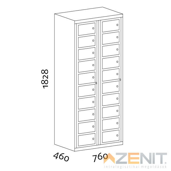 Kiadószekrény mosodai 1 oszlopos 10 rekeszes 5010 típus 1828x380x460 mm RAL 7035 szürke